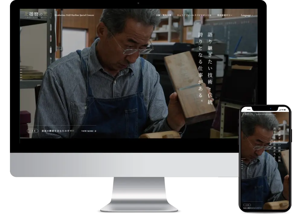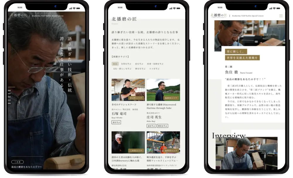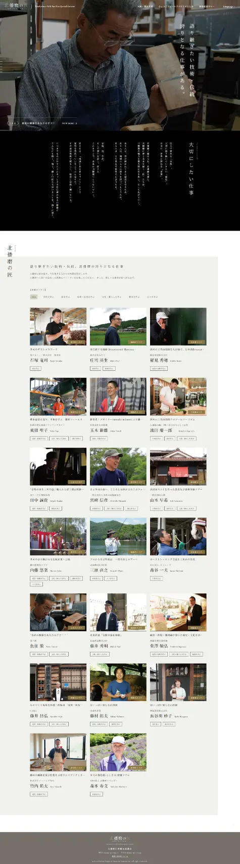 - 北播磨地域のフィールドパビリオン体験プログラムを提供する「匠」にスポットを当て、インタビュー形式で展開するスペシャル近コンテンツ「北播磨の匠」サイトの企画・制作を担当させていただきました。
