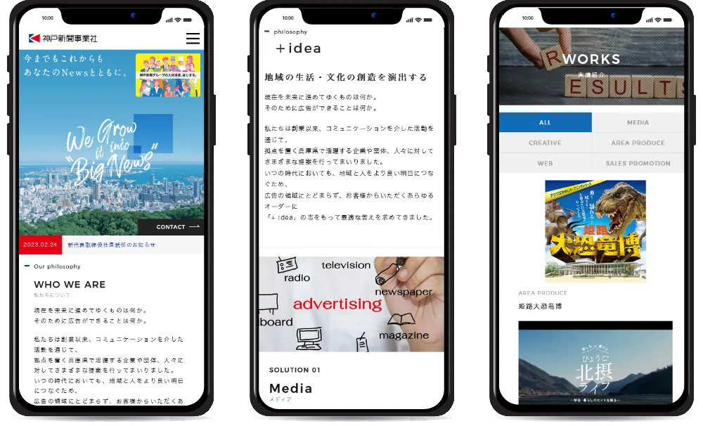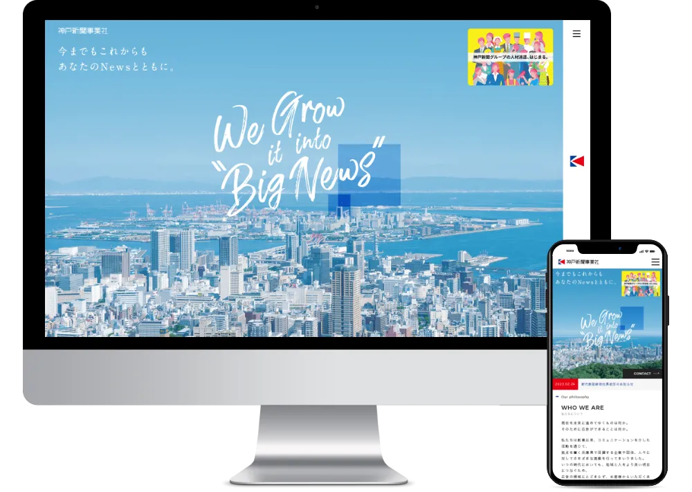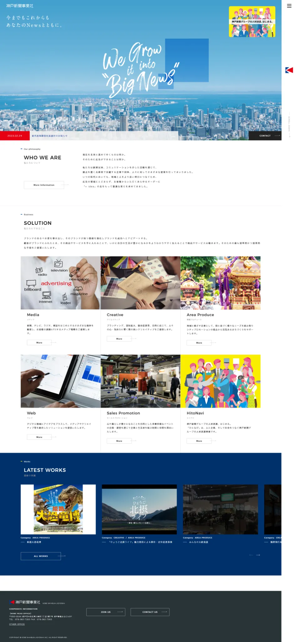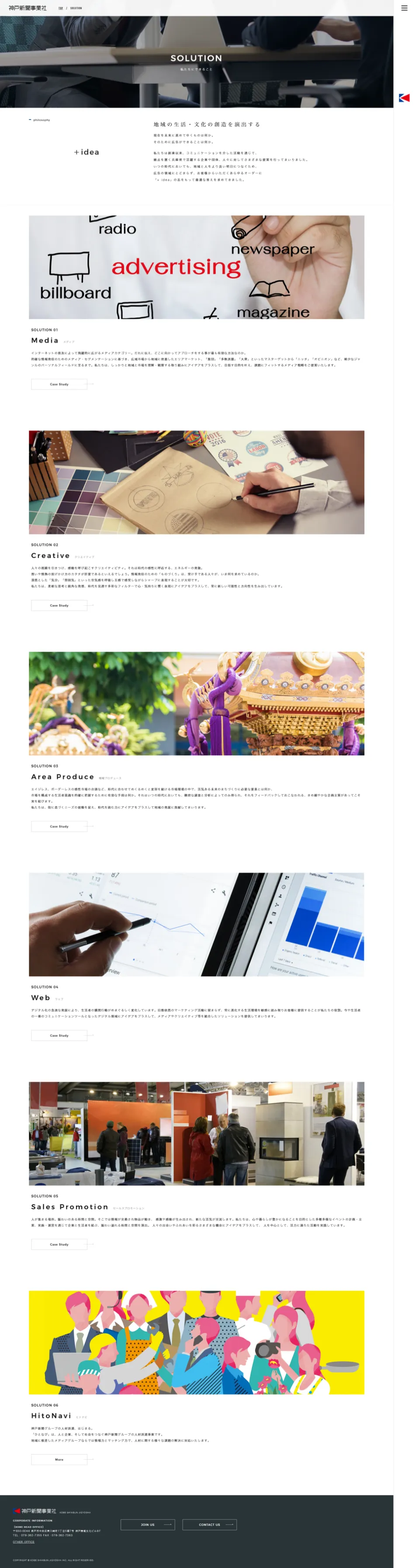 - 神戸新聞社グループとして、マーケティングからメディア・セールスプロモーション、WEB制作、クロスメディア戦略まで、総合プロデュース可能な広告代理店 「神戸新聞事業社様」のコーポレートサイト リニューアル制作を担当させていただきました。